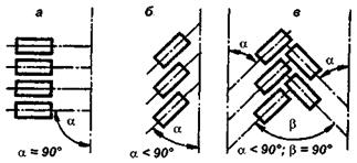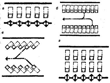 Рис. 3.14. Способы установки автомобилей на место хранения По углу расстановки автомобилей к оси внутреннего или наружного проезда расстановка подразделяется на прямоугольную (рис. 3.15, а) и косоугольную (рис. 3.15, б). При прямоугольной расстановке продольная ось автомобиля и ось проезда находятся под углом 90 °, а при косоугольной этот угол составляет обычно от 30 до 60 °. Разновидностью косоугольной расстановки является паркетная (рис. 3.15, в).