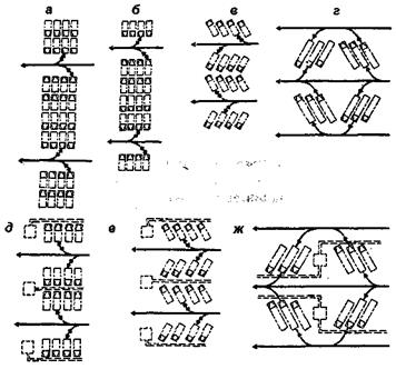 Рис. 3.16. Изменение площади проезда в зависимости от способа расстановки (Б, Б1 иБ2 – ширина проезда) С уменьшением угла расстановки увеличиваются площадь треугольника и длина проезда, в результате общая площадь, несмотря на сокращение ширины проезда, возрастает (рис. 3.16, б). При паркетной расстановке число треугольников уменьшается (рис. 3.16, в), благодаря чему по экономичности она занимает промежуточное значение между прямоугольной и косоугольной расстановками. Расстановка автомобиле – мест хранения на открытых площадках зависит от типа подвижного состава и наличия устройств для подогрева автомобилей в холодное время года (рис. 3.17). Схемы а – г предназначены для расстановки подвижного состава без устройств для подогрева автомобилей, схемы д – ж – с устройствами для подогрева. Расстановка по схемам а, б, д предназначена для хранения одиночных автомобилей и автобусов; по схемам в, е – для автопоездов в составе автомобиля – тягача с полуприцепами и сочлененных автобусов; по схемам г, ж – для автопоездов в составе автомобиля с одним или несколькими прицепами.