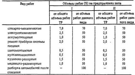 3. Производственные филиалы АТП. Предназначены для централизованного выполнения работ ТО и ТР подвижного состава эксплуатационных филиалов. В производственных филиалах выполняются работы ТО – 2, при определенных условиях – ТО – 1 и ТР в объеме 80 – 85 % общего объема работ ТР. В основном это трудоемкие работы по замене агрегатов и узлов, кузнечно – рессорные и другие работы, которые не производятся в эксплуатационных филиалах. в его составе могут находиться одна или несколько автоколонн, т. е. филиал может частично выполнять функции и эксплуатационного филиала. 4. Производственно – технические комбинаты (ПТК) и базы централизованного технического обслуживания (БЦТО) (табл. 7.3). - создаются для выполнения наиболее трудоемких работ ТО и ТР для одного или двух семейств автомобилей одного типа. По мере развития и совершенствования ПТБ производственные функции ПТК и БЦТО могут расширяться за счет выполнения работ ТО – 1, кузовных работ, ремонта прицепного состава и т. п. Таблица 7, 3. Примерное распределение объемов ТО и ТР по вилам работ, выполняемых на БЦТО и ПТК [20]