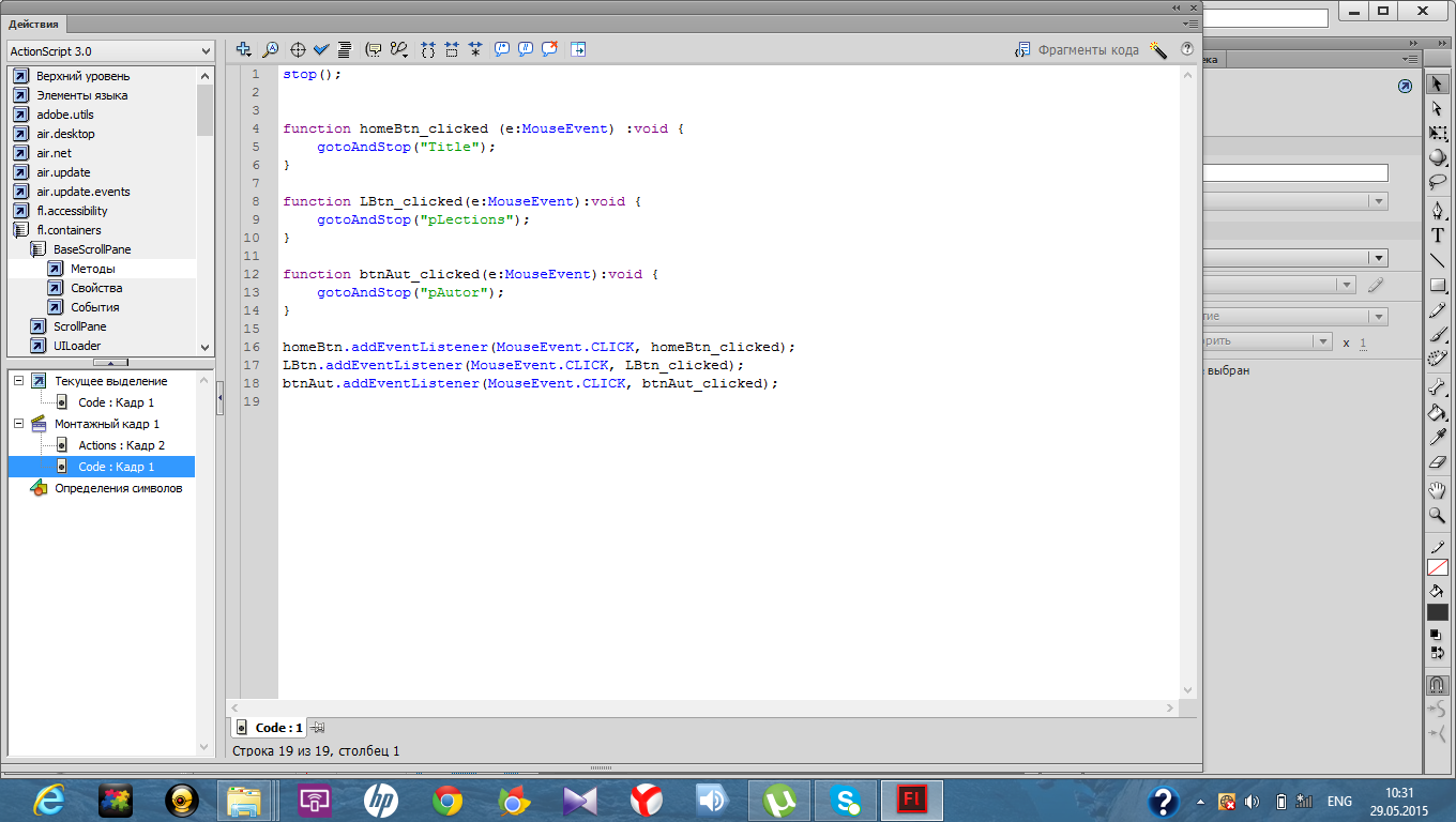 Рисунок 15. Код языка ActionScript 3.0 для работоспособности кнопок.