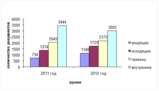Рисунок 3. Показатели количества документов по годам Таблицы, схемы и рисунки, занимающие страницу и более, помещают в приложение, а небольшие - на страницах работы. Оформление формул. Формулы выделяются из текста в отдельную строку, располагаются по центру. Выше и ниже каждой формулы должна быть оставлена одна свободная строка. Если формула не умещается водну строку, она переносится после знаков: равенства (=), сложения (+), вычитания (-), умножения (х), деления (:), других математических знаков. Нумеровать следует наиболее важные формулы, на которые имеются ссылки в последующем тексте. Не рекомендуется нумеровать формулы, на которые нет ссылок в тексте. Порядковые номера формул обозначают арабскими цифрами в круглых скобках, у правого края страницы. Пояснение значений символов и числовых коэффициентов приводится непосредственно под формулой в той же последовательности, в которой они даны в формуле. Значение каждого символа и числового коэффициента следует давать с новой строки. Первую строку пояснения начинают со слова " где" без двоеточия. В последней строке пояснения указывается источник, например: После определения общей годовой трудоемкости работ можно определить численность персонала по следующей формуле: