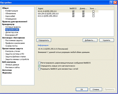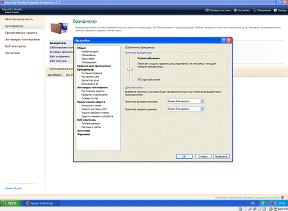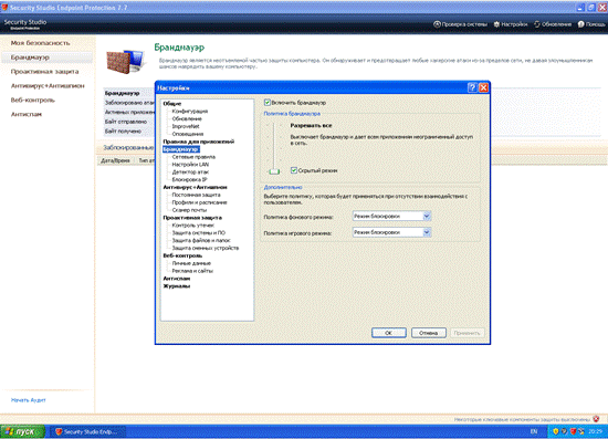 Режим обучения при попытках сетевого доступа со стороны приложений, типовой набор правил для наиболее известных приложений.