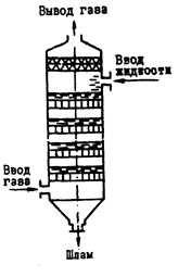 Р и с. 9.6. Схемы основных способов мокрого пылеулавливания: а - в объеме жидкости; б - пленками жидкости; е - распыленной жидкостью; 1 - пузырьки газа; 2 - капли жидкости; 3 - твердые частицы. Скрубберы (газопромыватели). При объемно-жидкостном способе поток запыленного газа пропускают через определенный объем жидкости. Для этой цели используют пенные пылеуловители с провальными тарелками или тарельчатые скрубберы, эффективность которых может достигать 90-95%. На рис. 9.7 представлен тарельчатый скруббер.