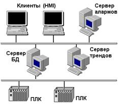 Во втором случае система создается полностью модульной (сервер ввода/вывода, сервер алармов, сервер трендов, и т.д.). Для небольших проектов все модули могут исполняться на одном компьютере. В проектах с большим количеством переменных модули можно распределить на несколько компьютеров в разных сочетаниях. Вариант клиент-серверной архитектуры такой системы представлен на рисунке 5.4. В клиент-серверной архитектуре системы управления, представленной на рисунке 5.4, функции сбора и хранения данных, управления алармами и трендами распределены между тремя серверами. Функция HMI реализуется на станциях-клиентах. Например, SCADA Citect имеет в своем составе пять функциональных модулей (серверов или клиентов): § I/O - сервер ввода/вывода. Обеспечивает передачу данных между физическими устройствами ввода/вывода и другими модулями Citect. § Display - клиент визуализации. Обеспечивает операторский интерфейс: отображение данных, поступающих от других модулей Citect, и управление выполнением команд оператора. § Alarms - сервер алармов. Отслеживает данные, сравнивает их с допустимыми пределами, проверяет выполнение заданных условий и отображает алармы на соответствующем узле визуализации. § Trends - сервер трендов. Собирает и регистрирует трендовую информацию, позволяя отображать развитие процесса в реальном масштабе времени или в ретроспективе. § Reports - сервер отчетов. Генерирует отчеты по истечении определенного времени, при возникновении определенного события или по запросу оператора.