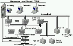 · Станции KFCS предназначены для высокоскоростного управления. Они включают в свой состав следующие компоненты: · блок управления (FCU), включающий внешний интерфейс с сетью V-net, а также дублированные процессорные платы, блоки питания, аккумуляторные батареи и интерфейсные платы шины ESB; · узел блока модулей ввода/вывода, включающий аналоговые, дискретные и многоточечные модули ввода/вывода, интерфейсные модули связи с блоком управления (ESB) и удаленными узлами (ER); · модули связи с полевой шиной (FF H1). Имеется два типа узлов блока модулей ввода/вывода: · локальный узел блока ввода/вывода, подключаемый непосредственно к блоку управления (FCU) и находящийся в шкафу станции (Рисунок ниже); · дистанционный (удаленный) узел блока ввода/вывода с интерфейсом Ethernet, монтируемый в удаленном шкафу рядом с датчиками и исполнительными устройствами. Для подключения к блоку управления локальных узлов, устанавливаемых в шкафу станции управления, используется шина ESB. Шина ESB может иметь резервирование, а ее максимальная протяженность составляет 110 м, а скорость - 128 Мбит/с. Для подключения к блоку управления удаленных узлов с помощью интерфейсного модуля, устанавливаемого в шкафу станции управления, используется шина ER. Эта шина также может быть зарезервирована. Узлы блоков ввода/вывода, расположенные на шине ER, устанавливаются в удаленных шкафах или на стойках. Максимальное расстояние при передаче составляет 185 м при использовании Ethernet-совместимого коаксиального кабеля 10Base2, 500 м - при использовании коаксиального кабеля 10Base5 и до 2 км - при использовании повторителей оптической шины. Компоненты станции управления KFCS монтируются в специальном шкафу или в стойках. Станция управления поддерживает до 10 блоков ввода/вывода (до 8 модулей ввода/вывода в каждом блоке). Станции LFCS адаптированы для систем управления с большим количеством ввода/вывода. В станции управления LFCS с подключенными устройствами через шину RIO реализовано резервирование центрального процессора. Возможно также резервирование шины RIO и различные варианты монтажа в шкафу или на стойке. В варианте с резервированием блока управления резервирование имеют процессорная плата, блок питания, аккумуляторный блок и интерфейсный модуль шины RIO. Узлы блоков ввода/вывода, подключаемые к блоку управления с помощью шины RIO, не обязательно должны находиться в шкафу станции управления. При удалении блоков ввода/вывода от станции на расстояние до 750 м используется экранированная витая пара. Применение повторителей шины и оптоволоконной связи увеличивает расстояние до 20 км, причем повторители и оптоволоконные линии можно чередовать до четырех раз. Краткая характеристика DCS-систем на примере системы PlantScape (Honeywell) основными компонентами системы являются: · гибридный контроллер для дискретного управления и управления · интегрированным процессом; · - функциональный сервер; · - операторский интерфейс (HMI); · - программное обеспечение сервера и контроллеров; · - сети управления ControlNet. Компоненты системы PlantScape были разработаны так, чтобы функционировать как единая высоко оптимизированная система, обеспечивая выполнение таких функций и такую эффективность, которые обычно недоступны для систем со слабой взаимосвязью человеко-машинного интерфейса (HMI) и программируемых логических контроллеров (PLC). Проце