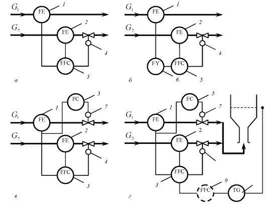 1 – бункер. 2 – транспортер; 3 – регулятор; 4 – регулирующая заслонка; 5 – электродвигатель Рисунок 7.4. Схемы регулирования расходов сыпучих веществ: Регулирование соотношения расходов двух веществ можно осуществлять тремя способами. · При незаданной общей производительности расход одного вещества (рисунок 7.5, а) G1, называемый «ведущим», может меняться произвольно; второе вещество подается при постоянном соотношении γ с первым, так что «ведомый» расход равен JG1. Иногда вместо регулятора соотношения используют реле соотношения и обычный регулятор для одной переменной (рисунок 7.5, б). Выходной сигнал реле 6, устанавливающего заданный коэффициент соотношения γ, подается в виде задания регулятору 5, обеспечивающему поддержание «ведомого» расхода. · При заданном «ведущем» расходе кроме АСР соотношения применяют и АСР «ведущего» расхода (рисунок 7.5, в). При такой схеме в случае изменения задания по расходу G1 автоматически изменится и расход G2 (в заданном соотношении с G1). · При заданной общей нагрузке и коррекции коэффициента по третьему параметру. АСР соотношения расходов является внутренним контуром в каскадной системе регулирования третьего технологического параметра (например, температуры в аппарате). При этом заданный коэффициент соотношения устанавливается внешним регулятором в зависимости от этого параметра, так что G2 = JfyJG1 (рисунок 7.5, г). Особенность настройки каскадных АСР состоит в том, что на задание внутреннему регулятору устанавливают ограничение хрн < хр < хрв. Для АСР соотношения расходов это соответствует ограничению ун < γ < ув. Если выходной сигнал внешнего регулятора выходит за пределы [хрн, хрв], то задание регулятору соотношения остается на предельно допустимом значении γ (т. е. Ji1 или J6).