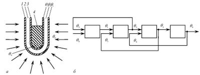 : 1 - защитный чехол; 2 - воздушная прослойка; 3 - стенка термометра; 4 - рабочая жидкость. Рисунок 7.15. Принципиальная (а) и структурная (б) схемы термометра