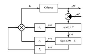 АСР числа рН. Системы регулирования рН можно подразделить на два типа, в зависимости от требуемой точности регулирования. Если скорость изменения рН невелика, а допустимые пределы ее колебаний достаточно широки, применяют позиционные системы регулирования, поддерживающие рН в заданных пределах: рНн ≤ рН ≤ рНв. Ко второму типу относятся системы, обеспечивающие регулирование процессов, в которых требуется точное поддержание pH на заданном значении (например, в процессах нейтрализации). Для их регулирования используют непрерывные ПИ- или ПИД-регуляторы. Общей особенностью объектов при регулировании рН является нелинейность их статических характеристик, связанная с нелинейной зависимостью рН от расходов реагентов. на рисунке 7.16 показана кривая титрования, характеризующая зависимость рН от расхода кислоты G1. Для различных заданных значений рН на этой кривой можно выделить три характерных участка: первый (средний), относящийся к почти нейтральным средам, близок к линейному и характеризуется очень большим коэффициентом усиления; второй и третий участки, относящиеся к сильно щелочным или кислым средам, обладают наибольшей кривизной. На первом участке объект по своей статической характеристике приближается к релейному элементу. Практически это означает, что при расчете линейной АСР коэффициент усиления регулятора настолько мал, что выходит за пределы рабочих настроек промышленных регуляторов. Так как собственно реакция нейтрализации проходит практически мгновенно, динамические характеристики аппаратов определяются процессом смешения и в аппаратах с перемешивающими устройствами достаточно точно описываются дифференциальными уравнениями 1-го порядка с запаздыванием. При этом, чем меньше постоянная времени аппарата, тем сложнее обеспечить устойчивое регулирование процесса, так как начинают сказываться инерционность приборов и регулятора и запаздывание в импульсных линиях.