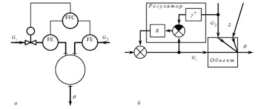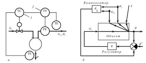 1 – регулятор соотношения; 2 – компенсатор. Рисунок 8.6. Функциональная (а) и структурная (б) схемы разомкнутой АСР температуры в теплообменнике смешения с компенсацией двух возмущений