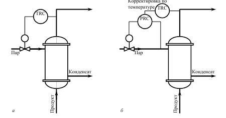Рисунок 8.14. а – схема регулирования работы теплообменника воздействия на расход греющего пора; б – каскадная система регулирования температуры продукта