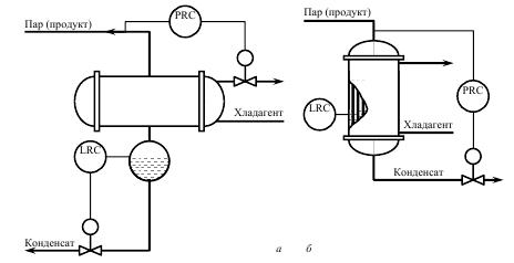 Возможно также регулирование скорости теплопередачи путём поддерживания постоянства температуры продукта на выходе из теплообменника клапаном, установленным на линии отвода конденсата. Это приводит к частичному замещению теплообменника конденсатом, что в свою очередь скажется на суммарной величине коэффициента передачи теплообменника, а следовательно, и на скорости теплопередачи. Такая система реагирует более медленно, чем система с клапаном на линии пара, её применение рекомендуется лишь при отсутствии резких возмущений по нагрузке. Но вместе с тем она позволяет лучше использовать тепло водяного пара, так как значения его давления и температуры более высоки вследствие отсутствия дополнительных гидравлических сопротивлений на паропроводе, а отводимый конденсат принимает температуру несколько меньшую, чем температура конденсации пара. Это позволяет повысить эффективность работы теплообменника на 5-7 %. Кроме того, по размерам клапан, установленный на линии отвода конденсата будет меньше того, который установлен на линии подачи греющего пара. Процесс конденсации технологического продукта может быть охарактеризован температурой конденсата этого продукта. Непосредственное регулирование этих величин с воздействием на расход пара, являющийся нагрузкой конденсатора, не представляется возможным. В этом случае наиболее широко применяют схемы, предусматривающие поддержание постоянства давления паров технологического продукта с воздействием на расход хладагента или конденсата, так как контуры регулирования давления достаточно динамичны. Регулирование уровня путём отвода конденсата (рисунок 5.16, а) обеспечивает соблюдение материального баланса конденсатора. По расходу хладагента можно судить о тепловой нагрузке объекта. Изменение расхода конденсата продукта (рисунок 5.16, б) обуславливает изменение теплообменной поверхности, благодаря частичному заполнению конденсатора жидкостью. Последнее, вследствие того, что при конденсации коэффициенты передачи паров значительно выше, чем при охлаждении конденсата, приводит к изменению скорости теплопередачи. Тепловую нагрузку объекта определяют по текущему значению уровня конденсата.