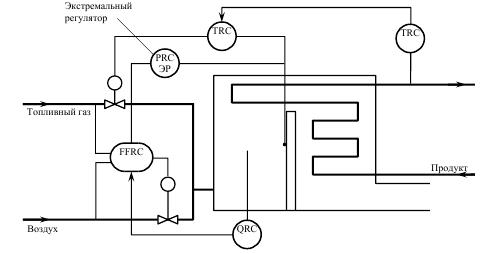 Так как зависимость температуры в топке от соотношения " топливо - воздух" имеет экстремальный характер, при автоматизации трубчатых печей применяют системы экстремального регулирования. На рисунок 8.21 экстремальный регулятор отыскивает максимальные значения температуры дымовых газов над перевальной стенкой, воздействуя на регулятор соотношения " топливный газ - воздух", управляющий подачей первичного воздуха. При регулировании соотношения " топливный газ - воздух" необходимо обеспечить меры безопасности, так как при недостатке воздуха в топке может образоваться взрывоопасная смесь. Следует предусмотреть ограничения расхода топлива так, чтобы этот расход никогда не превышал максимального допустимого значения, соответствующего текущему значению расхода воздуха. При уменьшении расхода воздуха относительно определенного значения нужно обязательно автоматически уменьшать подачу топлива в топку.