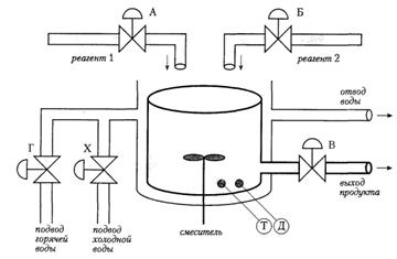 Управление последовательностью событий и бинарное управление. Простой химический реактор, представленный на рисунке 9.1, — пример системы управления последовательностью событий. В химическом реакторе реагенты перемешиваются с помощью смесителя. Входные потоки реагентов и выход продукта регулируются входными клапанами А и Б и выходным клапаном В. Соответственно давление в баке контролируется датчиком Д, а температура - датчиком Т. Температура регулируется горячей или холодной водой, подаваемой в окружающий бак кожух; потоки воды регулируются клапанами Г (горячо) и X (холодно).