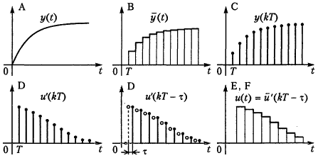 Дискретный сигнал y(kT) поступает в процессор ЭВМ, где производится расчет текущих значений управляющего воздействия. В идеальном случае на выходе ЭВМ (точка D) мгновенно формируется дискретный сигнал u'(kT). С учетом запаздывания - смещенная импульсная последовательность u'(kT-τ), где τ < Т, или, полагая для простоты τ =Т, сигнал u'((k-1)T). В моменты времени t = kT- τ сигнал с выхода ЭВМ u'(kT- τ) поступает на выходной регистр ВыР, который обеспечивает его сохранение в течение интервала Т. Тем самым обеспечивается преобразование импульсной последовательности в кусочно-непрерывный сигнал ū '(kT- τ) (точка Е). Этот элемент схемы является фиксатором. Цифроаналоговый преобразователь, как уже отмечалось, является пассивным элементом и поэтому сигнал на его выходе (точка F) по информационному содержанию совпадает с входным сигналом и является входным сигналом объекта управления.