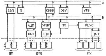 Вся совокупность устройств, подсоединенная к интерфейсу Б, образует систему связи ЭВМ с объектом. Состояние объекта характеризует информация, поступающая от датчиков физических величин (ДФВ). Эта информация после преобразования в соответствующих звеньях системы связи с объектом поступает в ЭВМ и составляет поток измерительной информации. От ЭВМ на входы исполнительных устройств (ИУ), приводящих объект в требуемое состояние, поступает поток управляющей информации в виде цифровых или аналоговых сигналов. Управляющая информация с каналов ввода-вывода (КВВВ) поступает в коммутатор цифровых управляющих сигналов (КЦУС), с которого передается либо непосредственно на исполнительные устройства дискретного типа, либо в цифроаналоговый преобразователь (ЦАП) для преобразования и последующей передачи на входы аналоговых исполнительных устройств. К интерфейсу А вместе с каналами ввода-вывода подключен блок внешних прерываний (ВВП) процессора (П) и устройство текущего времени (УТВ). ВВП по сигналам от датчиков прерывания (ДП), связанных с объектом управления, и сигналам от УТВ формирует различные циклы обработки информации и управления объектом. Коммутатор аналоговых сигналов (КАС) и коммутатор цифровых сигналов (КЦС), связанный с устройством приема цифровой информации (УПЦИ), составляют входной коммутатор системы управления, который осуществляет раздельное во времени подключение датчиков. Коммутатор цифровых управляющих сигналов (КЦУС) является выходным коммутатором, осуществляющим раздельное во времени подключение входов исполнительных устройств. Исполнительные устройства используют либо аналоговые сигналы, либо дискретные, причем длительность дискретных сигналов обычно значительно превышает длительность сигналов управляющей информации. В связи с этим система связи ЭВМ с объектом управления должна содержать технические средства, запоминающие управляющую дискретную информацию до замены ее новой информацией или формирующие управляющие воздействия, воспринимаемые входами исполнительных устройств. Связь ЭВМ с объектом в системе автоматического управления может быть синхронной, асинхронной и комбинированной. При синхронной связи процесс управления с помощью тактовых сигналов устройства текущего времени (УТВ) разбивается на циклы одинаковой продолжительности. Каждый цикл начинается с появлением тактового сигнала на входе блока прерывания. Вначале цикла осуществляется последовательный опрос датчиков, контролирующих состояние объекта управления. Сигналы датчиков преобразуются в форму, необходимую для ввода этих сигналов в ЭВМ. Поступившая в ЭВМ информация обрабатывается, и формируются управляющие воздействия на объект, которые после соответствующего преобразования в системе связи ЭВМ с объектом передаются на исполнительные устройства. Затем ЭВМ либо останавливается, либо выполняет другие программы, не связанные с системой автоматического управления. Выполнение этих программ прерывается следующим тактовым сигналом УТВ. Управляющие воздействия, сформированные в начале цикла, остаются неизменными в течение всего цикла. При асинхронной связи с объектом ЭВМ реагирует на сигналы прерывания, поступающие от датчиков прерывания, непосредственно связанных с объектом. Каждому сигналу прерывания соответст