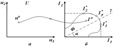 где Умадоп – допустимое значение количества мотоалкилата на выходе; Uдоп - область возможных значений вектора U. Сводные критерии управления. Оптимальность по Парето. Обозначим через Ivv -тый показатель функционирования процесса и будем для простоты считать, что в результате оптимизации желательно любой из m таких показателей (частных критериев) увеличить. Если некоторые из показателей, например капиталовложения М, нужно уменьшить, то соответствующий им частный критерий Iv примем равным – М. Через u обозначим параметры процесса и системы управления, подлежащие оптимальному выбору, и будем первоначально считать задачу полностью детерминированной, полагая, что значение каждого из частных критериев становится известным при задании u. Таким образом, каждой точке uo в пространстве U параметров соответствует точка Io в пространстве I критериев (рисунок 12..1). Ясно, что оптимальное решение по одному критерию I 1 приводит в точку I*1 (рисунок 12..1, б) и не совпадает с оптимальным решением по критерию I 2(точкой I* 2). Чтобы найти оптимальное решение u*, можно пойти по пути формирования из частных критериев Iv свободного критерия Ф. Приведем несколько способов получения Ф.