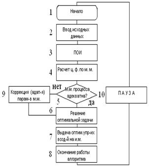 ПОИ – первичная обработка информации; ц.ф. – целевая функция; м.м. – математическая модель; и.м. – исполнительные механизмы; адап-я – адаптация