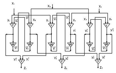 Система из двух полученных уравнений определяет алгоритм управления для двух аппаратов. Данный алгоритм реализует логическую систему с памятью, которая находиться в соответствии с принципом «кто раньше». Проверим найденный алгоритм, рассматривая различные сочетания значений аргументов: 1. Пусть первым пришел сигнал х1 = 1. Поскольку в предыдущий момент соблюдалось условие х2 = 0, то у2 =0, у1 = 0 обязательно. Следовательно, Поэтому в уравнении (10) получим: у1 =1·1=1. При таком сочетании сигналов первый аппарат включается на регенерацию. 2. Пусть теперь вслед за сигналом х1 = 1 пришел сигнал х2 = 1. Эта ситуация соответствует случаю, когда второй аппарат готов к регенерации, а первый аппарат еще не прошел стадию регенерации. Тогда у1 = 1, а 3. Когда первый аппарат закончит работу в режиме регенерации, сигнал х1 снова станет равным «0». Последует у1 =0· 4. Если теперь поступит сигнал х1 = 1, в то время как второй аппарат не прошел регенерацию, первый аппарат встанет в очередь. Это следует из того, что Перейдем теперь к рассмотрению общего случая, когда в одной нитке имеется m аппаратов, один из которых в каждый момент времени находиться на регенерации. Из работающих m аппаратов первым может подать сигнал готовности любой аппарат, например j -й. По условиям задачи сигнал у1 должен заблокировать, т.е. запретить включение на регенерацию всех остальных m -1 аппаратов. Для осуществления этого требования сигнал у1 должен быть связан логическим соотношением «кто раньше» с сигналами включения у всех остальных m -1 аппаратов. Следовательно, j -го аппарата связи сигналов с сигналами от других аппаратов выразятся следующими уравнениями: С первым аппаратом