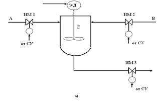 Задачи и алгоритмы оптимального автоматизированного управления периодическими процессами. При автоматизации технологических объектов существенное место занимают задачи переключения оборудования по циклическим (временным) программам. Распространенность таких задач, как и приведенных ниже задач логического управления, обусловлена спецификой химического производства, в которой важная роль отводится аппаратам периодического действия. В качестве алгоритма работы таких систем используются так называемые циклограммы – графики в координатах Y-X где по оси Y указывается исполнительные механизмы регулирующих органов, управляющие потоками рабочих веществ, Э/Д мешалок, транспортеров, задвижек и т.д., а по оси X –время их включения и отключения. В качестве примера рассмотрим емкость E, в которую подаются компоненты A и B. После перемешивания потоков A и B (мешалка с Э/Д) осуществляется их слив. Схема объекта и циклограмма работы системы приведены на рисунке 5.1. Из циклограммы видно, что поток А подается в емкость в течение первых 2-х минут. Поток B подается также в течение 2-х минут, начиная со второй минуты. Перемешивание включается, начиная с 3-й минуты, и длится тоже 2 минуты. По истечении четырех минут включается СЛИВ, который продолжается одну минуту. Циклические системы относят к так называемым “безрефлексным” системам, т.к. они работают по жестким временным программам, независимо от состояния технологического объекта. Например, в приведенной на рисунке 13.1 системе перемешивание с помощью мешалки (Э/Д) включается независимо от того были поданы в емкость компоненты А и В при открытии клапанов ИМ.1 и ИМ.2 или нет. Реализуются циклические системы, как правило, с помощью специальных устройств (программаторов) или контроллеров, запрограммированных на циклическое управление[1, 2].