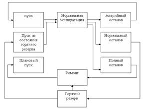При разработке функциональной структуры АСУ ТП необходимо учитывать все режимы работы ТОУ. При этом АСУ ТП может находиться в следующих состояниях: нормальной эксплуатации; горячего резерва; ремонта; пуска; останова (Рисунок 13.6). Разрабатываемая система управления должна эффективно работать во всех состояниях. Исключение составляет ремонт, управление которым не входит в сферу задач управления технологическим объектом. Состояние нормальной эксплуатации и возникающие при этом задачи управления будут рассмотрены ниже, традиционно они более изучены. Частным случаем с точки зрения задач автоматизации является состояние горячего резерва. Поэтому задачи автоматизации горячего резерва не будут рассматриваться самостоятельно, а совместно с режимом нормальной эксплуатации.