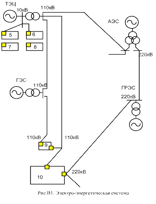 Электрическая станция – электроустановка для производства электрической и тепловой энергии. Электрическая линия – электрическая установка, содержащая систему электрических проводников, предназначенная для передачи электрической энергии. Электрическая подстанция – электроустановка, предназначенная для преобразования одного напряжения в другое. Электрическая система – это комплекс электроустановок для производства, транспорта и потребления электрической энергии. Энергетическая система – комплекс установок для производства, потребления электрической и тепловой энергии. Электрические установки потребителей – это электрические линии, сети, подстанции, электродвигатели привода производственных механизмов и установок, осветительные установки, электротехнологические установки (электропечи, сварочные аппараты, устройства электроискровой обработки и т.д.), находящиеся на территории потребителей (промышленных предприятий, коммунального хозяйства, транспортных установок и т.д.). Расположение перечисленных установок показано на схеме электроэнергетичес-кой системы рис.В1. Электрические машины: трансформаторы, асинхронные машины, синхронные машины, электрические машины постоянного тока. Трансформаторы: силовые, силовые специального назначения, автотрансформаторы, индукционные регуляторы, измерительные трансформаторы, испытательные трансформаторы. Трансформаторы повышающие и понижающие, однофазные и трехфазные, однообмоточные и трех- и многообмоточные, масляные и сухие. Применяются: на электрических станциях и станционных и системных подстанциях, на подстанциях потебителей, в производственных, бытовых установках. Асинхронные машины: электродвигатели привода производственных и бытовых механизмов, генераторы ветроэлектрических станций, генераторы когенерационных установок, микромашины. Синхронные машины: мощныегенераторы тепловых, атомных электростанций, ГЭС, генераторы когенерационных установок, мощные электродвигатели производственных установок, маломощные микромашины устройств автоматики Электрические машины постоянного тока: мощные электродвигатели транспортных и производственных установок, маломощные микромашины устройств автоматики, бытовой техники, аппаратуры
