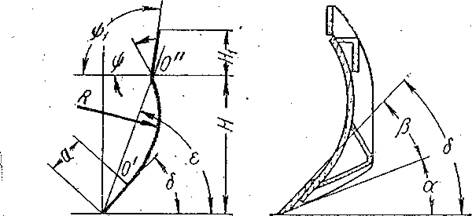 где Gбул - сила тяжести бульдозера (при проектировании новых бульдозеров значение Gбул может приниматься равным 1, 17...1, 22 силы тяжести базовой машины), Н; fсц - коэффициент сцепления. Приведенные выше уравнения для определения высоты отвала бульдозера справедливы для бульдозеров с номинальной силой тяги до 400 кН (40 т). При больших значениях силы тяги высота отвалов может ориентировочно определяться по тем же уравнениям, но с коэффициентами при вторых членах уравнений, равными единице. Отвалы универсального назначения рекомендуется снабжать козырьком, препятствующим пересыпанию грунта через отвал при толчках, на подъемах и в случаях, если процесс движения стружки по отвальной поверхности нарушается. Высота козырька H1 (по вертикали) должна составлять 0, 1...О, 25 от высоты отвала Н. При определении высоты отвала и козырька необходимо учесть требование обеспечения хорошего обзора при подъеме отвала в транспортное положение. Угол резания δ, угол заострения ножа β и задний угол α (Рис. 2.2, б) связаны между собой зависимостью