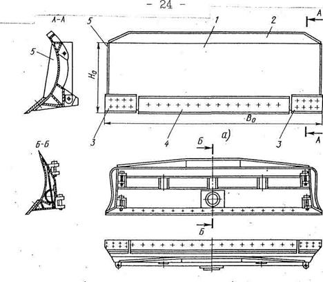 Конструкция элементов рабочего оборудования бульдозера определяется его назначением. Основным элементом оборудования является отвал (Рис. 1.4). Он представляет собой обычно коробчатую сварную конструкцию, оснащенную с рабочей стороны гнутым листом 1, ас тыльной стороны ребрами жесткости, проушинами. (Рис. 1.4, а) или подпятником (Рис. 1.4, б) для присоединения соответственно к толкающим брусьям или раме и гидроцилиндром. По ширине отвал чаще имеет прямолинейную форму. В таком исполнении он находит применение как на машинах, где отвал всегда располагают перпендикулярно к продольной оси, так и на машинах с изменяющимся углом между ними. Меньшее применение на бульдозерах получили специальные отвалы 1 (Рис. 2.5). Их устанавливают, как правило, только перпендикулярно к продольной оси машины. Отвал сферической формы (Рис. 2.5, а) применяют для перемещения разрыхленных и непрочных грунтов. Он имеет выступающие вперед концевые участки 2 и позволяет перемещать на 20-25% больший объем грунта, чем отвал прямолинейной формы. Отвал с выдвигающимися вперед боковыми зубьями 4 (Рис.2.5, б) предназначен для разработки и перемещения крепких каменистых грунтов. Его применяют на бульдозерах большой мощности. Совкообразный отвал (Рис. 2.5, в) находит применение при разработке и перемещении на большое расстояние слабых грунтов. С помощью его бульдозер может отделить от массива грунт и, приподняв отвал, переместить к месту отсыпки. Короткий толкающий отвал (Рис. 1.5, г) применяют при совместной работе бульдозера со скрепером. Этот отвал снабжен амортизатором и имеет усиленную в средней части конструкцию. С помощью его бульдозер может выполнять функции токача для скрепера на участке разработки им грунта и производить планировочные работы. Все отвалы бульдозеров в нижней части имеют ножи 2, 3 (Рис. 1.5) и 3, 4 (Рис. 1.4). Последние обычно выполняют из нескольких секций. Передняя рабочая кромка ножей в большинстве случаев расположена в одной горизонтальной плоскости. В некоторых случаях для снижения сопротивления при копании, в особенности при разработке мерзлого грунта, среднюю секцию у ножа делают выступающей вперед (Рис. 1.5, в). Выступ h средней секции обычно принимается в зависимости от ее длины b и находится в пределах 1/12 < h/b < 1/3. Длину средней секции ножа b принимают в зависимости от длины L отвала и она составляют около b = О, 3L. В верхней части отвалы прямолинейной формы имеют узкую плоскую полосу-козырек 2 (Рис. 1.4). На машинах средней и большой мощности он обычно выполнен шириной около 100... 200 мм и расположен вертикально или с небольшим наклоном вперед. По концам большинство неповоротных отвалов имеют боковые щитки 5. Они установлены для снижения потерь грунта при транспортировании. Отвал присоединяют к базовой машине с помощью толкающих брусьев или толкающей рамы и гидроцилиндров. Первые осуществляют передачу к отвалу тягового усилия от базовой машины, а последние производят подъем и опускание отвала.