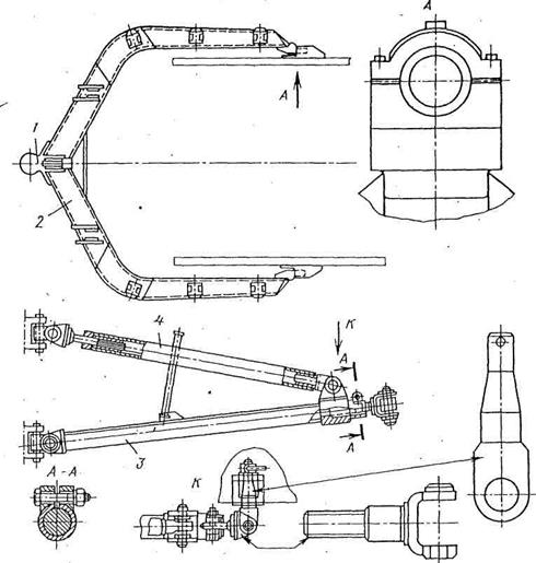 Рис. 1.6. Толкающая рама бульдозера с поворотным отвалом У колесных машин опускание отвала ограничивается возможным нижним положением толкающих брусьев, которые не могут быть опущены ниже опорной поверхности передних колес. Разрабатывается грунт бульдозером по-разному при применении рабочего оборудования с неповоротным или поворотным отвалом. Рабочий процесс бульдозера с неповоротным отвалом состоит из операции копания, перемещения грунта перед ним и разравнивания грунта в сооружении или отвале. При копании, совершаемом одновременно с перемещением машины, отвал заглубляется на толщину стружки в плотных грунтах 100...200 мм. Срезанный грунт, накапливаясь перед отвалом, образует валик, близкий по форме к треугольнику, в попе речном сечении, называемый призмой волочения. При транспортировании грунта катет призмы, прилегающий к отвалу, может достигать его высоты. После этого отвал приподнимают и транспортируют грунт к месту его укладки. Эта операция может сопровождаться потерей грунта, достигающей до 30% объема призмы волочения. Для восполнения потерь грунта процесс транспортирования обычно совмещают с копанием при стружке малой толщины. При производстве такими бульдозерами земляных работ на строительных объектах различают три схемы разработки и перемещения грунта: прямую, боковую и ступенчатую (Рис. 1.7). В первом случае копание и транспортирование грунта совершаются при возвратно-поступательном движении машины. При движении вперед бульдозер срезает грунт на участке его разработки, а затем транспортирует к месту укладки. После этого бульдозер задним ходом возвращается к месту начала копания грунта. Число таких ходов машины зависит от глубины выемки грунта и толщины стружки. При боковой схеме разработки резерв грунта находится сбоку от возводимого земляного сооружения, например насыпи. Бульдозер, перемещаясь параллельно оси насыпи, набирает грунт перед отвалом, разрабатывая его в резерве. Затем он поворачивает в сторону насыпи и отсыпает в нее грунт. Освободившись от грунта, бульдозер задним ходом возвращается в исходное положение в резерв. В дальнейшем он повторяет изложенный цикл работы. Ступенчатую схему разработки и перемещения грунта применяют в основном при сооружении насыпей (границы ее на рис.1.7 отмечены колышками 2 и 3) и планировке наклонных площадей, а также выполнении вскрышных работ. В этом случае бульдозер разрабатьюает'_1Ра^спортирует и Укладывает грунт в насыпь 4,