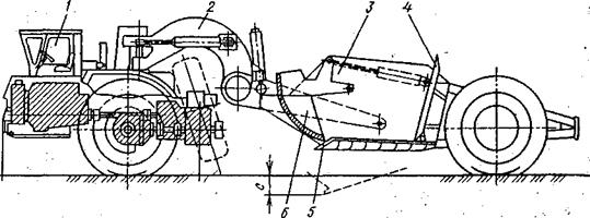 Скрепер является землеройно-транспортной машиной цикличного действия, выполняющей в процессе ее движения резание грунта, накопление его в ковше, транспортирование и выгрузку, иногда с разравниванием и уплотнением, в грунтовый отвал или сооружение. Эти машины широко применяют в дорожном строительстве для возведения насыпей и разработки выемок, в гидротехническом строительстве для рытья котлованов и сооружения дамб и плотин, в промышленном и гражданском строительстве для разработки котлованов, траншей и площадок, на вскрышных работах для срезки и рекультивации верхнего слоя грунта при добыче полезных ископаемых, а также на различных вспомогательных работах. Скреперы используют чаще всего при разработке грунтов 1-ой и 2-ой категорий. При предварительном рыхлении они могут разрабатывать и грунты 3-ей и 4-ой категорий. Для ускорения заполнения ковша и увеличения производительности скреперы иногда работают вместе с толкачом. Скреперы (Рис. 2.1) представляют собой комбинацию тягача 1 с тележкой 2, оснащенной ковшом 3, имеющим форму ящика, открытого спереди и сверху. Резание грунта осуществляется ножом 5, закрепленным на передней части днища. Толщина стружки изменяется в пределах 0, 12...О, 5 м в зависимости от размеров скрепера. Передняя часть ковша имеет шарнирно прикрепленную заслонку 6. Скреперы различают по виду соединения тягача с тележкой, по вместимости ковша, схеме соединения ковша с рамой, способу загрузки ковша.