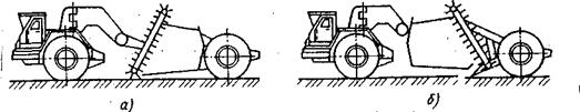 Рис. 2.2. Прицепной и полуприцепной скреперы. более высокие скорости, у этих машин часто устанавливают двигатель как на передней, так и на задней осях. Синхронность вращения колес на всех ведущих осях в этом случае достигается применением гидромеханических трансмиссий, имеющих гидротрансформаторы на каждом двигателе. На машинах с ковшом вместимостью 25 м3 и более в дополнение к этому привод всех колес выполнен также дизель-электрическим или дизель-гидравлическим с мотор-колесами. По вместимости ковшей скреперы делят на малые с ковшом вместимостью до 4м3, средние - до 5...12 м3 и большие - более 12 м3. По схеме соединения ковша с рамой машины скреперы делят на рамные (Рис. 2.1) и безрамные. В первом случае ковш с рамой соединен шарнирно. Передача тягового усилия тягача здесь в основном осуществляется через раму. При безрамной конструкции тяговое усилие воспринимается ковшом. Прочность и пространственная жесткость у него • обеспечиваются благодаря продольным и поперечным ребрам. - 34 - Загрузка ковшей может быть свободной и принудительной. В первом случае срезанная стружка грунта поступает в ковш за счет приложения тягового усилия. Это имеет место в процессе всего заполнения ковша. Во втором случае ковш наполняется с помощью скребкового элеватора (Рис. 2.3, а, б) или шнеков (Рис. 2.3, в-д).