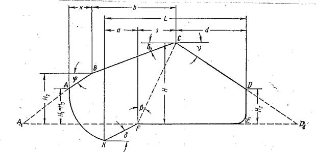Максимальный объём ковша (Рис. 2.4), который может быть заполнен при данной силе тяги, определяется возможной высотой наполнения Н, положением точек контура В и С, углами б0> v и ф под которыми откладывается грунт в ковше, внутренней шириной В, между боковыми стенками ковша.