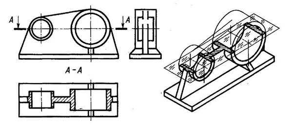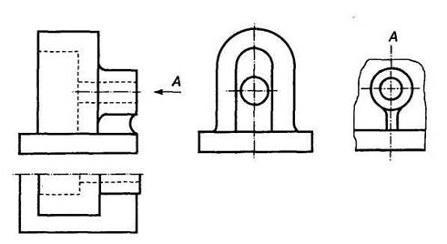 Для спрощення креслень або скорочення кількості зображень допускається: а) частину предмету, що знаходиться між спостерігачем і січною площиною, зображати штрихпунктирною потовщеною лінією безпосередньо на розрізі; такою накладеною проекцією на рисунку 5 на розрізі А—А показана форма виступу у деталі і його розташування;