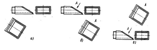 Слайд 3 Для зменшення кількості зображень допускається на видах показувати необхідні невидимі частини поверхні предмету штриховими лініями. Додатковий вигляд. Якщо яку-небудь частину предмету неможливо показати на розглянутих вище основних виглядах без спотворення форми і розмірів, то застосовують додаткові види, що отримуються на площинах, непаралельних основним площинам проекцій. Варіанти розташування додаткового вигляду на прикладі прямокутного хвилеводу показані на слайді 4, а, б, і в, при цьому розташування а) і б) переважно. Додатковий вигляд відзначають на кресленні написом типу А (слайд 4, б, і в), а у пов'язаного з додатковим виглядом зображенням предмету ставлять стрілку, указують напрям погляду, з відповідними буквеними позначеннями (стрілка А, слайд 4, б і, в). Коли додатковий вигляд розташований в безпосередньому проекційному зв'язку з відповідним зображенням, стрілку і напис над виглядом не наносять (слайд 4, а).