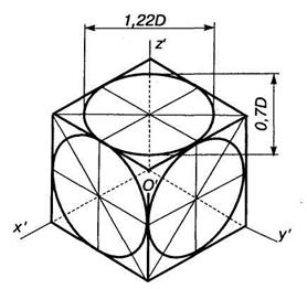 Відкладаючи паралельно координатним осям натуральні величини відрізків, дістаємо, що великі осі еліпсів дорівнюють 1, 22 D, а малі — 0, 7 D. Побудуємо дві проекції втулки (рис. 3, а) та ізометрію цієї втулки з вирізом передньої чверті (рис. 3, б). Побудову рекомендується починати із зображення в ізометрії горизонтальної проекції деталі. Маючи горизонтальну проекцію, легко за допомогою вертикальних ліній, на яких відкладаються розміри, взяті з фронтальної проекції, завершити побудову. Напрям ліній штриховки визначають після відкладання на осях однакових відрізків.