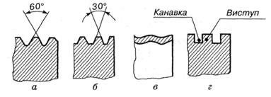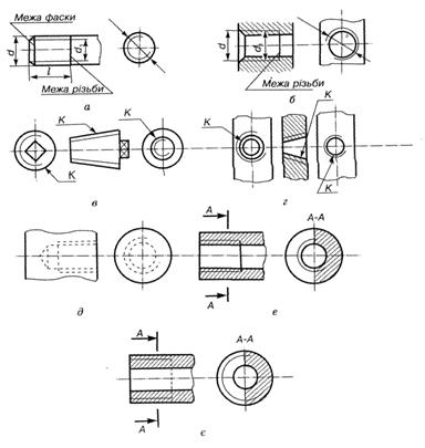 Рисунок 1 За призначенням різьби поділяють на кріпильні, ходові та спеціальні. Циліндричну різьбу характеризують такі параметри: 1. Зовнішній діаметр, який дорівнює діаметру умовного циліндра, що містить вершини зовнішньої різьби або западини внутрішньої різьби. 2. Внутрішній діаметр. 3. Середній діаметр різьби — це діаметр умовного циліндра, вздовж твірних якого ширина виступу профілю дорівнює ширині западини. 4. Крок різьби — це виміряна паралельно осі різьби відстань між відповідними точками двох сусідніх витків. 5. Хід різьби— це виміряна паралельно осі різьби відстань між відповідними точками на одній гвинтовій поверхні за один оберт профілю. Хід різьби дорівнює відстані переміщення гайки за один повний оберт. 6. Кут профілю різьб — кут між бічними сторонами профілю. 7. Висота вихідного профілю дорівнює Н. 8. Висота робочого профілю Н1 – відстань між вершиною та западиною профілю в напрямі, перпендикулярному до осі різьби. Номінальні значення зовнішнього, внутрішнього та середнього діаметрів мають відповідати ГОСТу. Зображення різьби на кресленнях. Будь-які різьби незалежно від їхнього типу зображують на кресленні умовно. Умовність полягає в проведенні суцільної основної лінії замість виступів різьби і тонкої суцільної лінії замість западин (рис. 2, а...є), що проводять на всю довжину різьби без збігу, захоплюючи фаски. На площині, перпендикулярній до осі різьбового стрижня, суцільну тонку лінію внутрішнього діаметра різьби проводять на 3/4 довжини кола, причому розімкнути її можна в будь-якому місці. Відстані між лініями зовнішнього та внутрішнього діаметрів різьби на всіх проекціях виконують не менше ніж 0, 8 мм і не більше від кроку різьби.