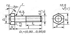 Різьбу, показану як невидиму, зображують аналогічно поданій на рис. 2, д. Позначення циліндричної різьби стосується зовнішнього діаметра і виконується за стандартом. Приклади нанесення розмірів різьби показані на рис. 2, а, б. Стандартні кріпильні деталі з різьбою. Ці вироби поділяють на деталі загального призначення та спеціальні. Нижче розглядатимемо тільки деталі загального призначення. Болти, гвинти, шпильки, гайки виготовляють зі сталі та кольорових сплавів. Залежно від умов експлуатації кріпильні деталі випускають з покриттям, яке має цифрове або літерне позначення. В позначення кріпильної деталі включається цифрове позначення покриття (якщо воно є). Найбільш широко застосовують болти з шестигранною головкою підвищеної, нормальної та грубої точності (класів А, В, С) з нормальною чи зменшеною головкою, з великим або дрібним кроком різьби, що випускають в одному або в кількох виконаннях. Болти випускають з шестигранною головкою номінальним діаметром різьби 6...48 мм, завдовжки 8...300 мм. (рис. 3)