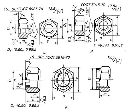 Приклад позначення: Болт М16 х 2 х 80, де 16 — номінальний діаметр; 2 — крок; 80 — довжина болта. Залежно від призначення та умов експлуатації гайки бувають шестигранні, шестигранні прорізні, корончасті тощо (слайд 1, а...в). Найширше застосовують шестигранні гайки, що випускаються в одному, двох, трьох виконаннях, підвищеної, нормальної та грубої точності; нормальної висоти, низькі, високі, особливо високі; з нормальним або зменшеним розміром " під ключ"; з великим або дрібним кроком. Приклад позначення: Гайка М10 х 1, де 10 – номінальний діаметр, 1 – крок.