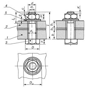 Болтове з'єднання деталей (слайд 5, а…е) виконують за допомогою болта, шайби та гайки (слайд 5, б). У деталях, що скріплюються, свердлять отвір для болта (слайд 5, в). Діаметр отвору залежить від характеру та умов роботи з'єднання, які визначають точність складання. Цим стандартом регламентується зазор між стрижнем болта та отвором. Якщо при цьому зазор буде менше ніж 1 мм, то на зображенні його можна дещо збільшити. В одержаний отвір вставляють болт, на нього надівають шайбу (слайд 5, г) і нагвинчують гайку (слайд 5, д). Довжину болта розраховують за умов достатньої довжини нарізаної частини для нормального затягування та наявності вільного кінця болта над гайкою (слайд 5, е), де d – зовнішній діаметр різьби; d1 = 0, 85 d; D = 2 d; Dш = 2, 2 d; Н = 0, 7 d; lо = (1, 5…2, 0) d; S = 0, 15 d; с = 0, 15 d; l = b + b1 + b2 + S + H + K.