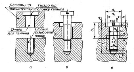 Слайд 6 На зображенні з'єднання шпилькою застосовують такі самі спрощення, як і при виконанні зображень болтового з'єднання. На кресленні з'єднання шпилькою наносять три розміри: діаметр різьби, діаметр отвору в приєднуваній деталі та довжину шпильки. Бажано доповнити зображення з'єднання специфікацією. З'єднання гвинтом. Це з'єднання виконують у такій послідовності. У деталі свердлять отвір (головним чином, глухий) — слайд 7, а, нарізають у ньому різьбу. В приєднуваній деталі свердлять отвір, діаметр якого вибирають залежно віддіаметра гвинта та степеня точності складання, і виконують гніздо (зенковку) під головку гвинта (циліндричне — для циліндричної головки і конічне — для конічної головки). В отвір приєднуваної деталі вставляють гвинт і загвинчують в отвір першої деталі (слайд 7, б, в) доти, доки деталі не з'єднаються. На кресленні гвинтового з'єднання наносять три розміри: діаметр різьби гвинта, діаметр отвору в приєднуваній деталі та довжину гвинта.