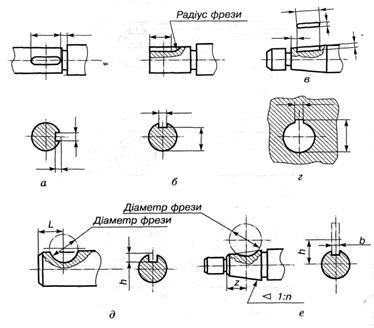 Слайд 8 Для призматичних і клиноподібних шпонок паз на валу фрезерують циліндричними або кінцевими фрезами. Довжина паза під клинову шпонку приблизно дорівнює подвійній довжині шпонки. Довжина паза під призматичну шпонку дорівнює її довжині, яка, в свою чергу, коротша за ширину маточини колеса (слайд 9, а). Паз у маточині колеса для клиноподібної шпонки виконують з уклоном 1: 100. Глибину пазів на валу та в маточині колеса вибирають для кожного типу шпонки з відповідних стандартів. Первинними при розрахунку параметрів шпонкового з'єднання є діаметр вала та ширина маточини колеса. Шпонкове з'єднання звичайно зображують у двох проекціях (слайд, б, в). Умовності при зображенні шпонкових з'єднань полягають у тому, що зазор між верхніми неробочими поверхнями дещо збільшують порівняно з дійсними його розмірами.