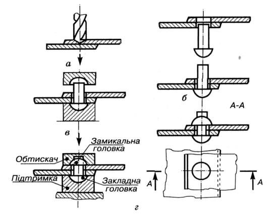 Особливістю штифтового з'єднання є те, що отвір під штифт свердлять одночасно у всіх деталях, які підлягають з'єднанню. Цим досягається високий ступінь взаємної фіксації з'єднуваних деталей. Штифт вставляють у отвір здебільшого запресовуванням. Розміри штифтів стандартизовано. Діаметр і довжину штифта вибирають залежно від розмірів з'єднуваних деталей. До позначення штифта входять його назва і розміри, наприклад, «Штифт циліндричний 5 х 30». Це означає, що циліндричний штифт має діаметр 5 мм і довжину 30 мм. Напис «Штифт конічний 10 х 70» означає, що в конічного штифта менший діаметр 10 мм, а довжина 70 мм. Штифтові з'єднання, як правило, показують за допомогою розрізів (слайд 11, 12). На складальних кресленнях штифти в розрізі показують, як і інші непорожнисті деталі, нерозсіченими, якщо січна площина проходить уздовж їх осі. 5. Заклепкові з'єднання Нерознімне з'єднання деталей, яке виконують за допомогою заклепки, називають заклепковим. У скріплюваних деталях свердлять отвір, діаметр якого дорівнює 1, 05 діаметра заклепки (слайд 13, а). В одержаний таким чином отвір вставляють заклепку (слайд 13, б) і виступну її частину розклепують до утворення замикальної головки (слайд 13, в, г). Щоб розклепування не було утрудненим, заклепки виготовляють з досить пластичних матеріалів.