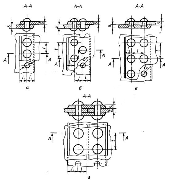 Слайд 13 Випускають заклепки з напівкруглою, потайною, напівпотайною і плоскою головками з покриттям і без нього. Діаметр та товщина заклепки залежить від товщини скріплюваних листів і визначається за спеціальними формулами. У з'єднанні заклепки розміщуються рядами, сукупність яких утворює заклепковий шов. Ці шви можуть бути однорядними (слайд 14, а, г), дворядними (слайд 14, б, в) та багаторядними. Залежно від розміщення заклепок у рядах їх поділяють на паралельні та шахові (слайд 14, б). За взаємним розміщенням з'єднуваних деталей шви бувають внапусток (слайд 14, а...в) і стикові (слайд 14, г). Заклепковий шов зображують у двох проекціях: головне зображення (простий або ступінчастий розріз) та вигляд зверху. На слайді 14 показано однорядний та різноманітні дворядні шви.