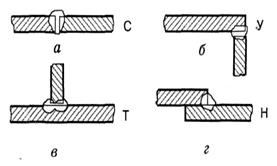 Слайд 14 6. Зварні з'єднання Зварні з'єднання є найбільш поширеними нерознімними з'єднаннями. Вони утворюються при розплавленні металу в зоні стику і його подальшому затвердінні. Метал, що затвердів після розплавлення, називають зварним швом. Зварні шви дістають зварюванням, плавленням і тиском. У першому випадку застосовують електродугове (Е), ручне (Р), напівавтоматичне (П), автоматичне (А) або газове (Г) зварювання. Одним з видів зварювання тиском є контактне (КТ) зварювання, що поділяється на точкове, роликове, рельєфне та стикове. Зварні шви класифікують за такими ознаками: 1) за способом взаємного розміщення зварюваних деталей (рис. 4, а...г) – стикові, (С), кутові (У), таврові (Т), внапусток (Н); 2) за формою підготовки кромок – без скосу кромок (рис. 5, а); з відбортовуванням (рис. 5, б, в); з різноманітними скосами кромок (рис. 5, г); 3) за характером виконання – суцільні, переривчасті, точкові, однобічні й двобічні.