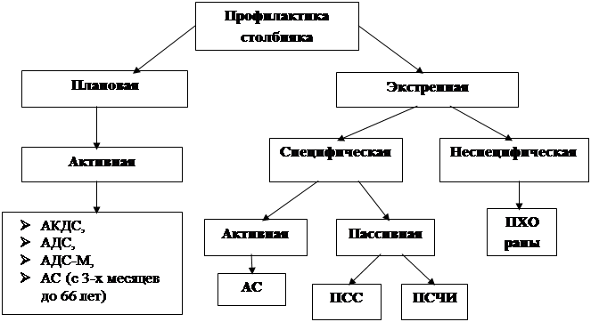 Экстренная профилактика столбняка у привитых детей и взрослых поводится при любой травме независимо от тяжести – введение 0, 5 мл АС. Экстренную профилактику непривитых детей и взрослых осуществляют введением 1 мл АС, а затем на другом участке тела шприцем 3000 МЕ ПСС по Безредко: предварительно для выявления чувствительности к лошадиному белку ставят внутрикожную пробу с разведённой 1: 100 сывороткой. Инъекцию производят на сгибательной поверхности предплечья в дозе 0, 1 мл и наблюдают 20 минут. Проба считается отрицательной, если размер папулы не превышает 0, 9 см. При отрицательной пробе подкожно вводят 0, 1 мл неразведенной сыворотки. Наблюдают 30 мин. При отрицательной пробе подкожно вводят (отсутствие зуда, крапивницы, повышение температуры) остальную дозу сыворотки 3000 МЕ вводят внутримышечно. Через 30-40 дней следует ввести 0, 5 мл АС, а через 9-12 месяцев – ещё 0, 5 мл АС. В связи с возможностью развития сывороточной болезни (повышение температуры, появление зуда, высыпание) и даже анафилактического шока, за каждым привитым необходимо обеспечить медицинское наблюдение в течение одного часа после введения. Место проведения прививок должно быть обеспечено средствами противошоковой терапии (адреналин, 5% раствор эфедрина, 10% раствором хлорида кальция, гормональные препараты, сердечные средства). Лица, получившие ПСС должны быть предупреждены о том, что при появлении признаков, характерных для сывороточной болезни, им надо немедленно обращаться за медицинской помощью. АДС-М – абсорбированный дифтерийно-столбнячный анатоксин с уменьшенным содержанием антигенов АКДС – абсорбированная коклюшно-дифтерийно-столбнячная вакцина АДС -адсорбированный дифтерийно-столбнячный анатоксин АС – анатоксин столбнячный ПСС – противостолбнячная сыворотка ПСЧИ – противостолбнячный человеческий иммуноглобулин ПХО – первичная хирургическая обработка.