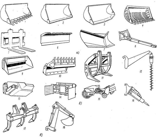 Рис. 5.4. Сменное рабочее оборудование одноковшовых погрузчиков: а - рабочие органы без силового привода; б - рабочие органы с силовым приводом; в - дополнительное оборудование; 1 - ковш для твердых пород с зубьями; 2 - ковш с прямолинейной режущей кромкой, 3 - ковш с V-образной режущей кромкой; 4 - скелетный ковш; 5 -грузовые вилы; б - бульдозерный отвал; 7 - плужный снегоочиститель; 8 - грузовая безблочная стрела; 9 - ковш с принудительной разгрузкой; 10 - двухчелюстный ковш; 11 - захват для длинномерных материалов; 12 - бурстолбостав; 13 - ковш для распределения бетона; 14 - захват для пакетов; 15 - дорожная щетка; 16 - гидромолот; 17 - рыхлитель; 18 - обратная лопата экскаватора. Ковши увеличенной и уменьшенной вместимости предназначены для погрузки грунтов с разными свойствами. Двухчелюстной ковш позволяет захватывать негабаритные предметы. Скелетный ковш предназначается для загрузки крупнообломочных материалов. Ковш с боковой разгрузкой - для выполнения работ в стесненных условиях. Ковш с принудительной разгрузкой имеет подвижную заднюю стенку. При ее перемещении при помощи гидроцилиндра и рычагов осуществляется принудительная разгрузка ковша. Такой ковш может применяться при погрузке материалов, обладающих большой липкостью. Грузовые крюки и петли - относятся к универсальным грузозахватным приспособлениям. Груз прикрепляется к этим приспособлениям при помощи канатных или цепных строп, или при помощи специальных захватов, подвешиваемых на крюк или петлю. Клещевые захваты - применяют при выполнении ПРР со штучными грузами определенной формы и размера для сокращения времени, затрачиваемого на подвеску и освобождение грузов и уменьшение ручных затрат. Подразделяются на захваты для штучных грузов в таре или упаковке и на захваты для штучных грузов без тары. В зависимости от степени автоматизации процесса захвата и освобождения груза захваты подразделяют на полуавтоматические (обеспечивающие автоматический захват груза при ручном освобождении) и автоматические (обеспечивающие захват и освобождение груза без применения рабочей силы).