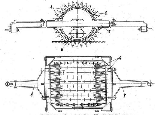 Рис. 6.5. Прицепной кулачковый статический каток ДУ-26А кулачки; 2 - валец с кулачками; 3 - рама; 4 - скребки; дышло; 6 - люк для загрузки балласта.