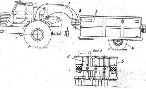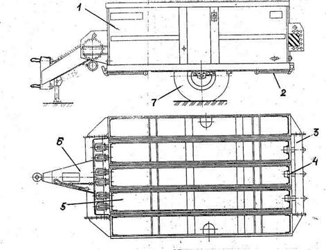 Рис. 6.6. Прицепной пневмоколесный каток ДУ-39Б бункер для балласта; 2 - люк для выгрузки балласта; задняя балка; 4 - механизм стопорения средних секции; секция катка;.6 - дышло; 7 - пневмоколесо.