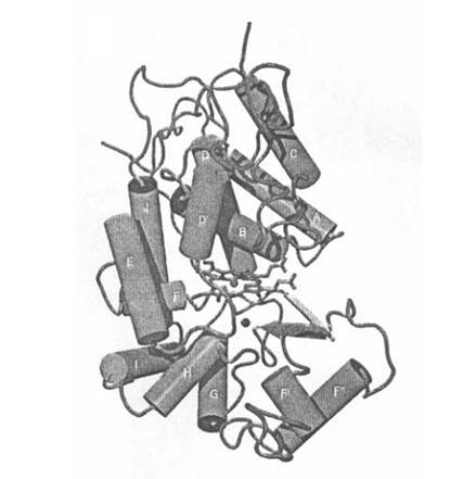 Рис. 1. Пространственная структура пероксидазы C хрена [11]. Особенностью процессов пероксидазного катализа является образование ряда спектрофотометрически различимых комплексов. Упрощенная схема пероксидазного цикла выглядит следующим образом: Е + H2O2 → E1; k1 E1 + АH2 → E2 + АH; k2 E2 + АH2 → Е + АH; k3 где Е, Е1, Е2 — соответственно исходная пероксидаза и ее окисленные формы; АН2, АН — соответственно исходный субстрат и его окисленная форма. Продукт первой стадии — E1, образующийся при действии пероксида водорода на фермент, представляет собой окисленное производное пероксидазы, содержащее два окислительных эквивалента. В Е1 железо имеет формальный заряд +4. Дополнительный окислительный эквивалент в молекуле Е1 локализуется либо на порфириновом макроцикле пероксидазы, либо на одной из функциональных групп фермента. Донорные субстраты могут восстанавливать соединение E1 непосредственно в нативный фермент (двухэлектронное восстановление) или через образование промежуточного соединения E2 (одноэлектронное восстановление). В реакции пероксидазного окисления, помимо пероксида водорода, в качестве окислителя (первого субстрата) могут выступать органические субстраты – алкилгидропероксиды, пероксибензольные кислоты и др. По отношению ко второму субстрату пероксидаза проявляет меньшую специфичность, поэтому целый ряд электронодонорных соединений могут использоваться в качестве субстратов пероксидазы и являться основой детектирующих систем в методах аналитической биохимии и клинической медицины.