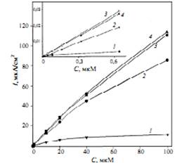 Рис. 2. Зависимость предельного кинетического тока электрохимического биосенсора от концентрации H2O2. На поверхности золотого электрода иммобилизованы нативная пероксидаза (1), рекомбинантная пероксидаза (2), рекомбинантная пероксидаза с шестью гистидиновыми остатками на N (3) и С (4) концах. Изучение влияния рН и доноров протона на константу скорости гетерогенного переноса электронов показало существенное повышение эффективности электронного переноса с увеличением концентрации H+ [23].