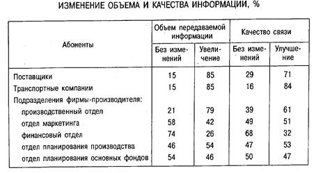Применение современных средств информационного отслеживания материальных потоков способствуют внедрению «безбумажной» технологии. Суть ее состоит в том, что, например, на транспорте вместо сопровождающих груз многочисленных документов (особенно в международном сообщении) по каналам связи синхронно с грузом передается информация, содержащая о каждой отправляемой единице все необходимые для характеристики товара реквизиты. При такой системе на всех участках маршрута в любое время можно получить исчерпывающую информацию о грузе и на основе этого принимать управленческие решения. С помощью «компьютерной логистики» на протяжении всей цепи обслуживания осуществляется анализ деятельности фирмы и дается оценка ее положения по сравнению с конкурентами. Признание важности всех видов информации, ее внутренних и внешних потоков, контроля за ними и их использованием привело во многих корпорациях к изменению форм деятельности подразделений, ответственных за функционирование информационных систем. Отделы по обработке данных стали называться отделами информации или информационными службами. При этом подверглись изменению их функции управления. Отделы информации или информационные службы в настоящее время оперируют всеми видами информационных потоков и отвечают за деятельность всех контролирующих систем корпораций и фирм. А руководители таких отделений или служб поднялись на высшую ступень иерархический лестницы корпораций. О позитивном влиянии использования средств связи на развитие логистики, вероятно, косвенно свидетельствуют данные о повышении качества информации и возросшем объеме обмена ею между всеми фирмами - участницами логистического процесса в конце 70-х и середине 80-х годов. Они приведены в табл. 1. Таблица 1